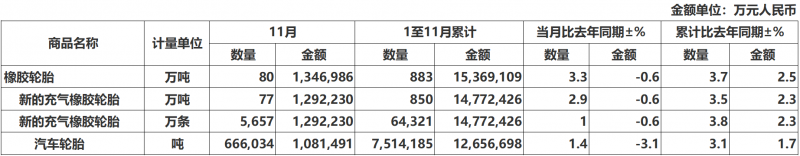 1-11月汽車輪胎出口量為751萬噸,同比增長3.1%;出口金額為1266億元,同比增長1.7%。