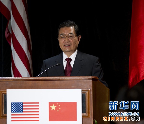 在熱烈的掌聲中,胡錦濤發表了題為《建設相互尊重、互利共贏的中美合作伙伴關系》的重要講話。胡錦濤指出,當前,國際金融危機導致的急劇動蕩逐漸緩解,世界經濟正在恢復增長,但不穩定不確定因素仍然較多,世界經濟復蘇進程仍將艱難曲折。面對復雜多變的國際形勢,面對各種風險和挑戰,中美兩國人民應該加強合作,同各國人民一道,共同分享機遇、應對挑戰,共同開創人類發展更加美好的未來。