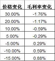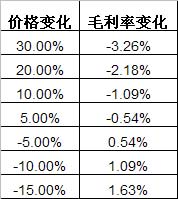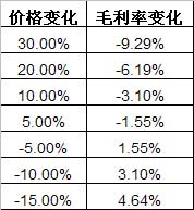 通過運用模擬運算法,靜態分析各種原材料價格變化對橡膠輪胎制造業毛利率的影響,如下圖所示: