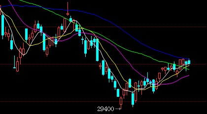 從圖形上看今天的最高點33450點正好頂在60日均線上,但此輪反彈的上漲趨勢依然不變,只是震蕩的幅度正在減小,總體上看也未有反轉跡象。